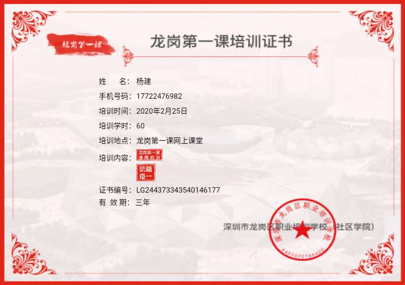 2019年2月24日,為減少接觸,公司組織全體員工在自己手機(jī)上關(guān)注“龍崗第一課學(xué)習(xí)平臺”,自行網(wǎng)上學(xué)習(xí)“龍崗第一課”通用知識篇和防疫篇一,并取得電子證書。