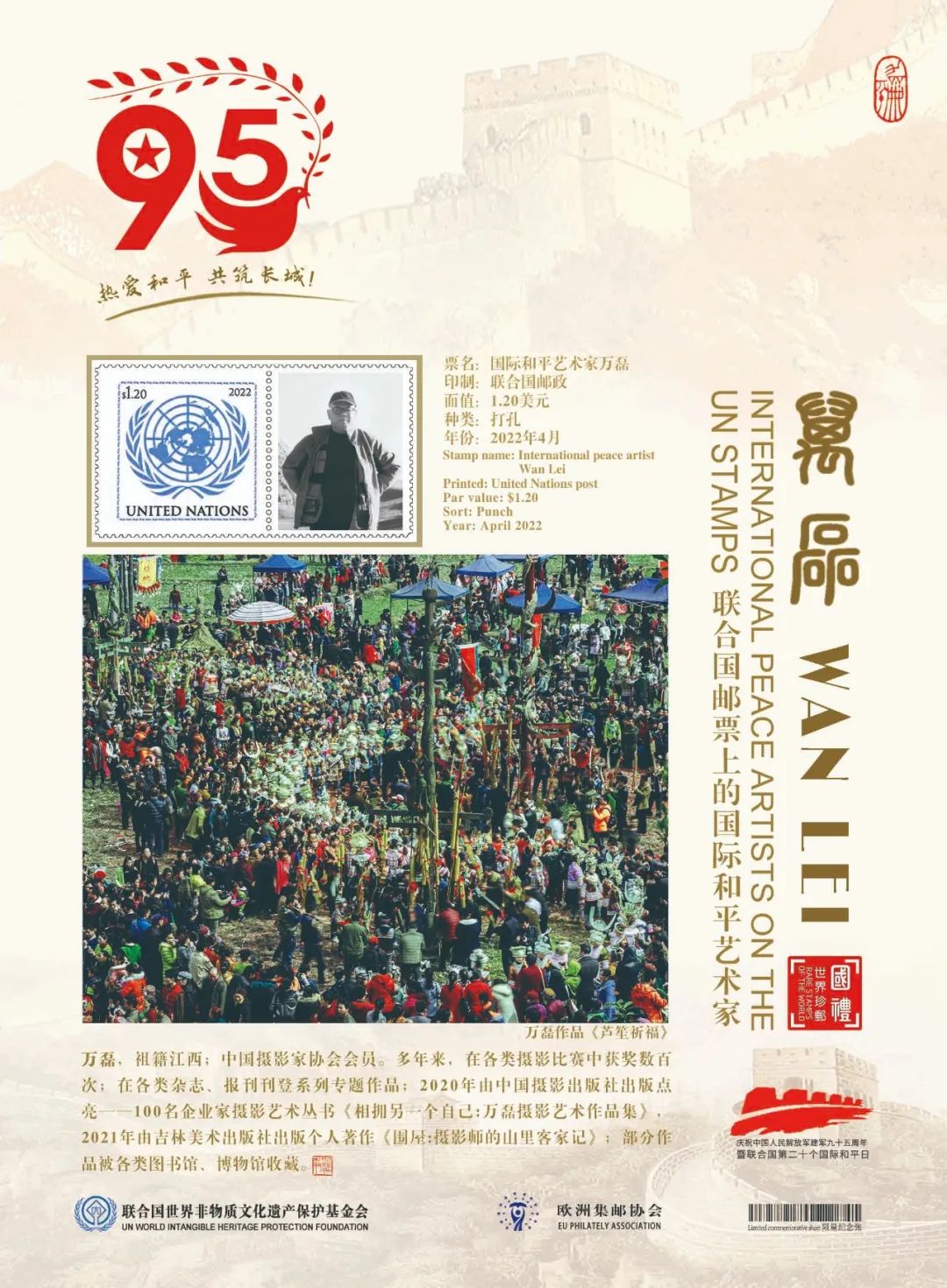 鑒于萬(wàn)磊在中國(guó)攝影藝術(shù)上的杰出成就和為國(guó)際文化交流所做出的卓越貢獻(xiàn),業(yè)經(jīng)中國(guó)國(guó)際文化藝術(shù)發(fā)展交流中心、歐洲集郵協(xié)會(huì)、山水丹青國(guó)際藝術(shù)中心、藝術(shù)財(cái)經(jīng)雜志等國(guó)際權(quán)威機(jī)構(gòu)組織推薦,萬(wàn)磊被聯(lián)合國(guó)世界非物質(zhì)文化遺產(chǎn)保護(hù)基金會(huì)授予“國(guó)際和平藝術(shù)家”榮譽(yù)稱號(hào)。這不僅是對(duì)中國(guó)藝術(shù)家杰出成就的肯定和贊譽(yù),也是對(duì)世界和平的深切呼喚!