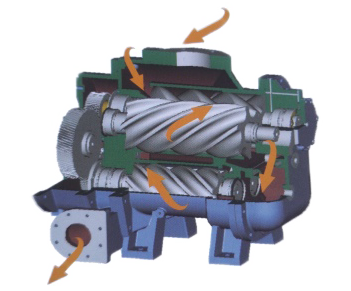 自然空氣通過(guò)空氣過(guò)濾器進(jìn)入第一級(jí)壓縮,在壓縮腔與少量潤(rùn)滑油混合,同時(shí)將混合氣體壓縮到級(jí)間壓力,壓縮后的氣體進(jìn)入冷卻通道,與大量油霧接觸,從而大大降低了溫度,降溫后的壓縮氣體進(jìn)入第二級(jí)轉(zhuǎn)子,進(jìn)行二次壓縮,被壓縮到最終排氣壓力。最后通過(guò)排氣法蘭排除壓縮機(jī),完成整個(gè)壓縮過(guò)程。
