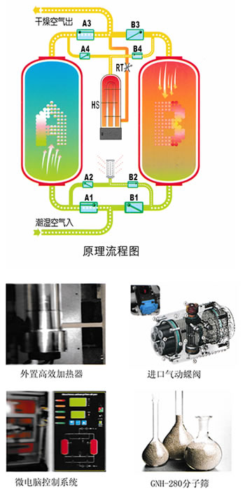 GNH-280分子篩:采用 GNH-280型吸干機專用分子篩,具有高效的吸附性能和高強度的耐磨性,吸附熱達到 4200 干焦。使用壽命長,降低實際使用的運行成本。