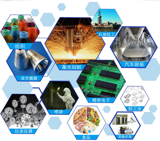 精密電子制造、液晶與半導(dǎo)體、工藝生物與制造行業(yè)、汽車高級(jí)凃裝工藝、鏡面噴涂與真空鍍膜、攝像頭與鏡片生產(chǎn)、高壓電絕緣、石油天然氣工業(yè)