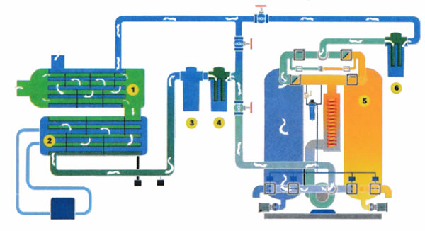 濕空氣首先進(jìn)入冷凍干燥系統(tǒng)中的預(yù)冷器與來自吸附干燥系統(tǒng)的干燥低露點(diǎn)空氣進(jìn)行熱交換,使低露點(diǎn)空氣溫度升高,同時(shí)降低了進(jìn)入蒸發(fā)器的壓縮空氣溫度,除卻一部分水份,使其降至常溫,減輕蒸發(fā)器的工作負(fù)荷。再進(jìn)入蒸發(fā)器進(jìn)行熱交換,使壓縮空氣冷卻至左右的露點(diǎn)溫度。壓縮空氣中的大部分水份、油份及部分雜質(zhì)在此被凝結(jié),經(jīng)過氣水分離器將空氣與水份充分分離,初步干燥后的壓縮空氣通過除油過濾器進(jìn)入吸附干燥系統(tǒng),空氣在吸附床層內(nèi)被高效率分子篩進(jìn)行深度吸附,最后得到低露點(diǎn)的壓縮空氣。低露點(diǎn)壓縮空氣再經(jīng)精密過濾器除去粉塵,最后得到超低的露點(diǎn)和潔凈的壓縮空氣。